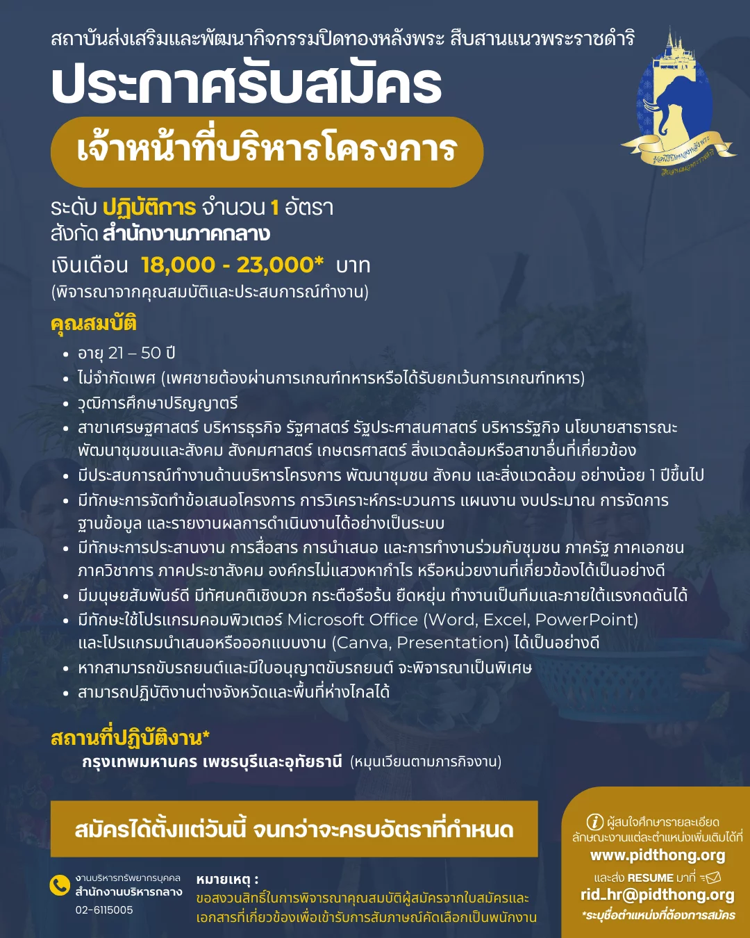 - มีประสบการณ์ทำงานด้านการบริหารโครงการ การพัฒนาชุมชน สังคม หรือสิ่งแวดล้อม ไม่น้อยกว่า 1 ปี