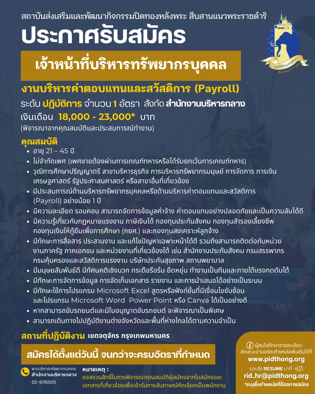 - มีประสบการณ์ด้านบริหารทรัพยากรบุคคลหรือด้านบริหารค่าตอบแทน (Payroll) และสวัสดิการอย่างน้อย 1 ปี