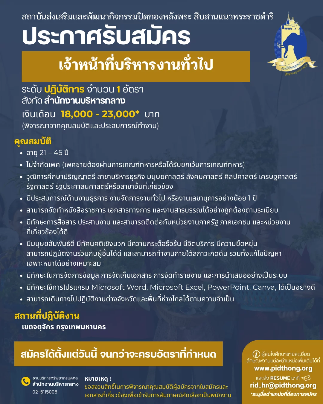 - มีประสบการณ์ปฏิบัติงานด้านงานธุรการ งานจัดการงานทั่วไป หรืองานเลขานุการอย่างน้อย 1 ปี